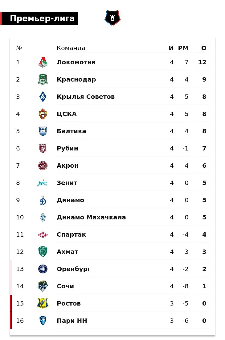 Места с 8-го по 10-е занимают «Зенит», «Динамо» и «Динамо» Махачкала, набравшие по 5 очков за 4 тура. «Спартак» занимает 11-ю строчку с 4 очками.