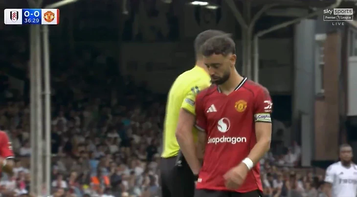 Пенальти в ворота «Фулхэма» принялся исполнять Бруну Фернандеш. В момент, когда португалец отходил назад для разбега, его плечо задел пробежавший мимо рефери.