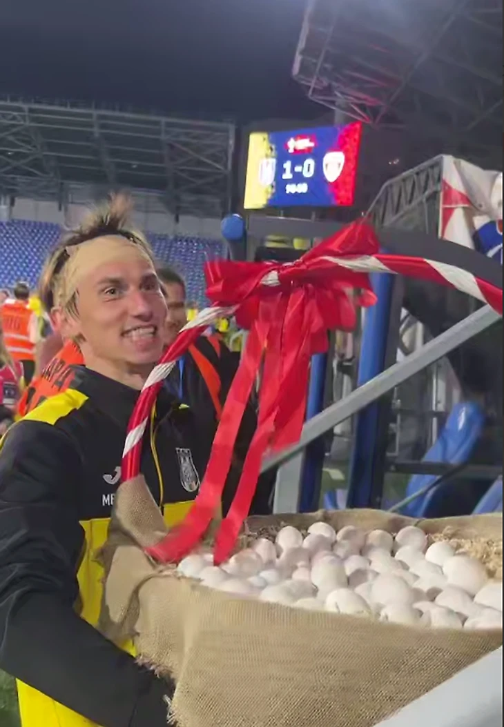 В качестве приза Нартову вручили корзину с яйцами. После матча полузащитник «Кристалл-МЭЗТ» подошел к трибуне и стал раздавать яйца болельщикам.