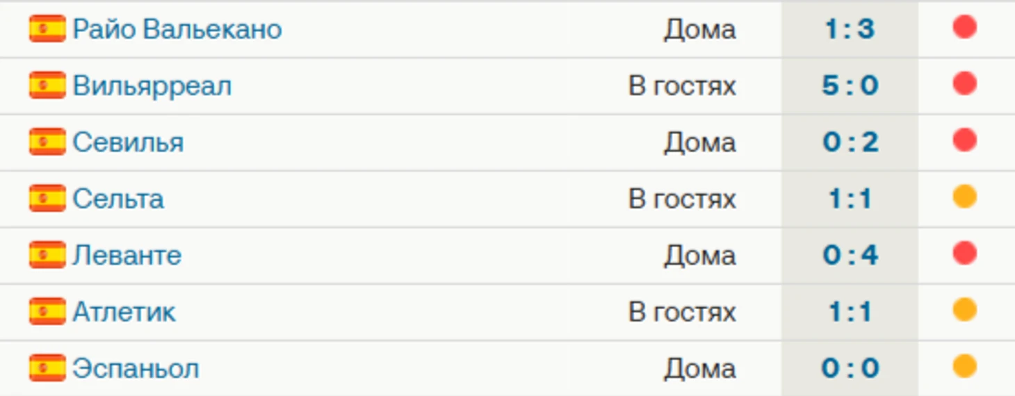 До этого были ничьи с «Атлетиком» (1:1) и «Сельтой» (1:1), а также поражения от «Леванте» (0:4), «Севильи» (0:2), «Вильярреала» (0:5) и «Райо Вальекано» (1:3).