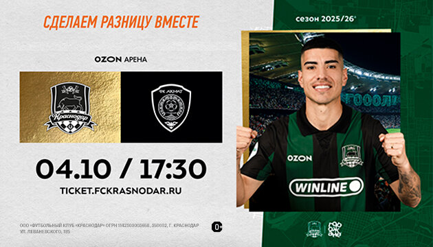 «Краснодар» принимает «Ахмат». Поддержите краснодарцев на стадионе в домашней игре с грозненцами!