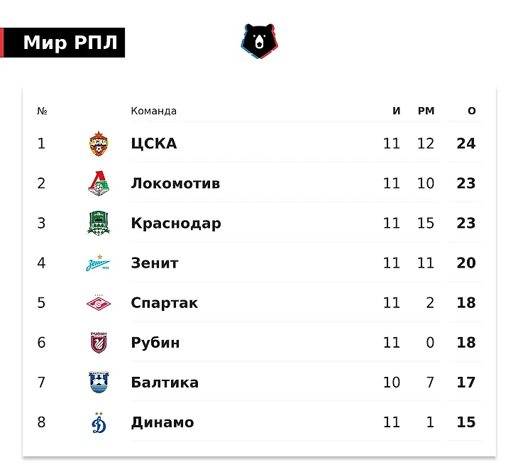 «Спартак» отстает от лидирующего ЦСКА на 6 очков после 11 туров Мир РПЛ
