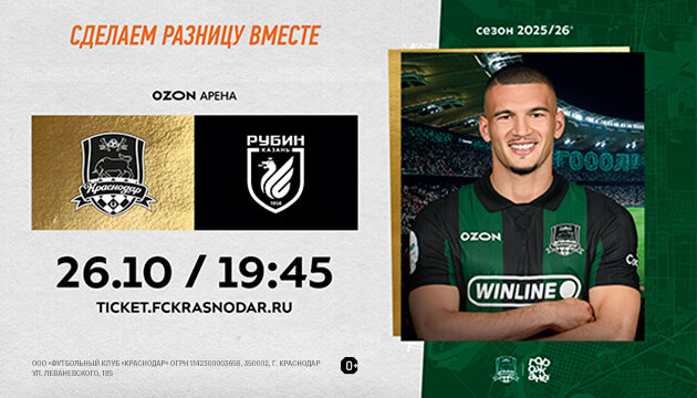 По итогам 12 туров «Краснодар» находится на втором месте турнирной таблицы чемпионата, обладая 26-ю очками. Казанцы же расположились на седьмой строчке, имея 18 очков в активе. Краснодарцам нужна ваша поддержка в матче против «Рубина»!
