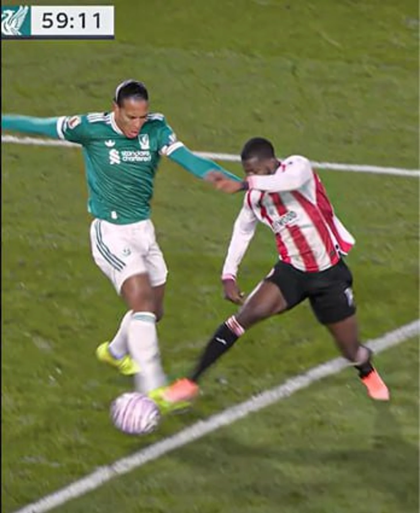 Главный судья Тим Робинсон изначально назначил штрафной удар. Ассистенты подсказали арбитру, что фол был совершен в пределах штрафной «Ливерпуля», и Робинсон указал на точку. Арбитр принял решение после общения с ВАР, без просмотра повтора.