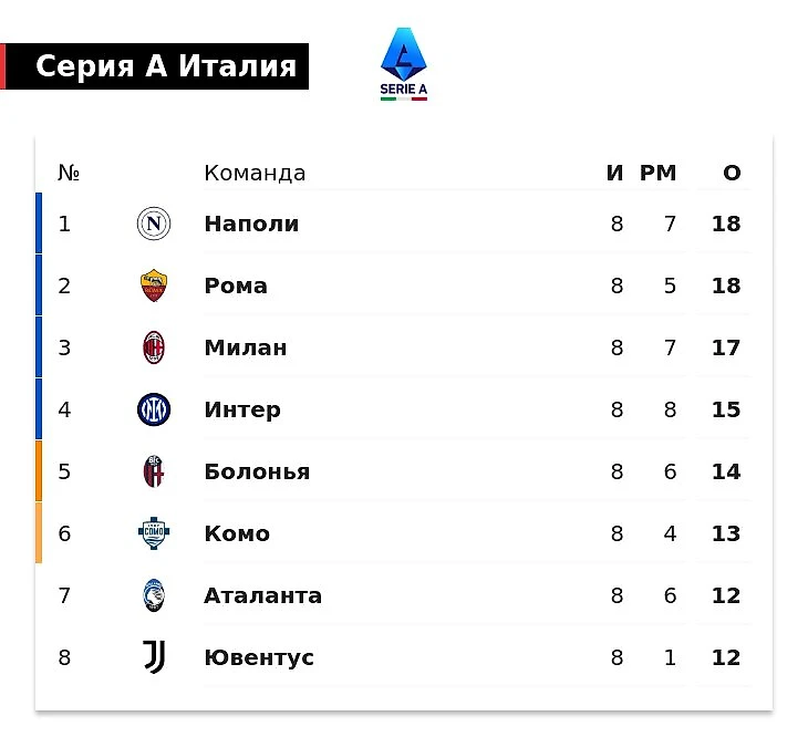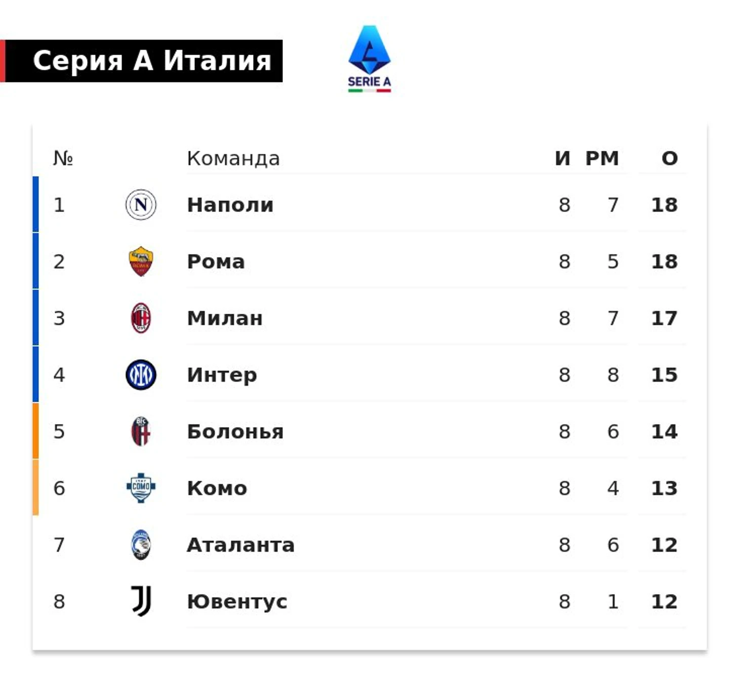 «Наполи» лидирует в Серии А после 8-го тура, опережая «Рому» по разнице мячей. «Милан» – 3-й, «Интер» – 4-й, «Ювентус» – 8-й