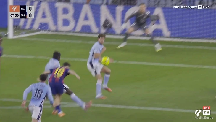На 9-й минуте хавбек каталонцев Фермин Лопес пробил из-за штрафной и попал в руку защитнику «Сельты» Маркосу Алонсо, который пытался увернуться.