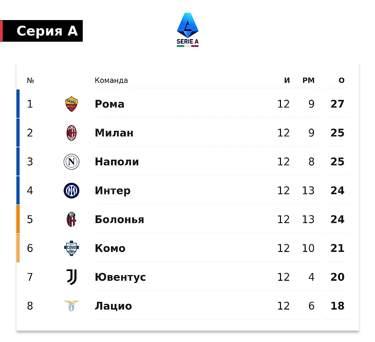 Набрав 21 очко, «Комо» расположился на 6-м месте. «Ювентус» опустился на 7-ю строчку – у него 20 баллов. «Бьянконери» сыграли вничью с «Фиорентиной» (1:1) 22 ноября.