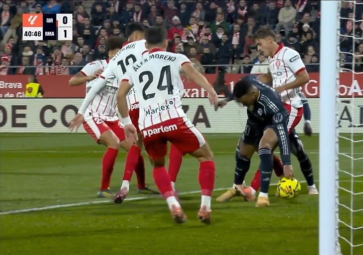 Нападающий «Реала» нанес точный удар по воротам соперника на 40-й минуте игры 14-го тура Ла Лиги. При этом форвард, борясь за позицию во вратарской, коснулся мяча рукой.