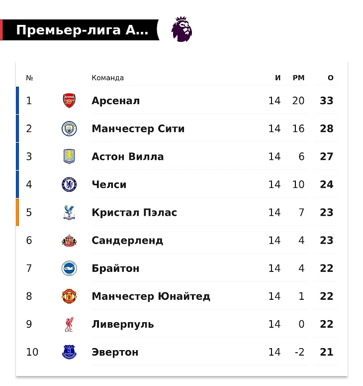 Действующий чемпион Англии «Ливерпуль» тоже набрал 22 очка после 14 туров. После матча «МЮ» команда Арне Слота опустилась на 9-ю строчку.