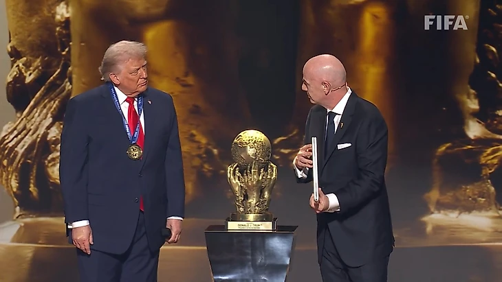 Политик получил награду, учрежденную в ноябре 2025-го, на церемонии жеребьевки группового этапа ЧМ-2026. Также руководитель ФИФА Джанни Инфантино вручил ему медаль, которую глава Соединенных Штатов Америки сразу надел.