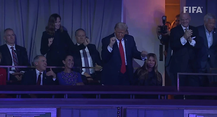 Во время песни политик станцевал свой фирменный танец, находясь в зале рядом с женой Меланией и президентом ФИФА Джанни Инфантино.