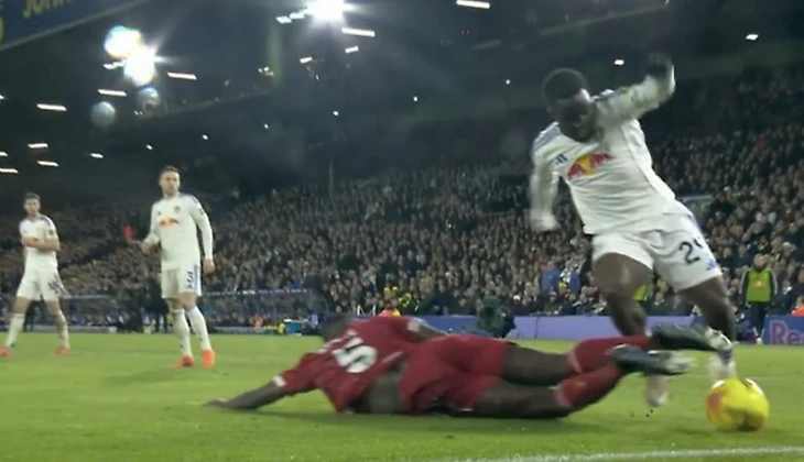 В ворота «Ливерпуля» назначили пенальти в игре с «Лидсом» – Конате в подкате сбил Ньонто. Калверт-Льюин забил, команда отыгралась с 0:2 после этого