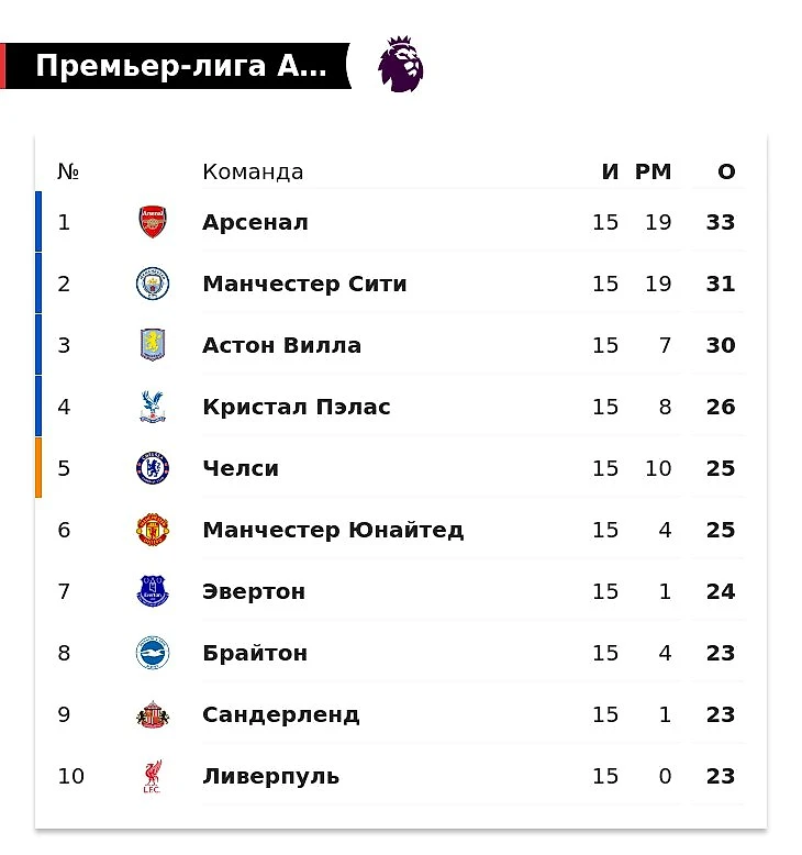 Команда Рубена Аморима набрала 25 очков и отстает от лидирующего «Арсенала» на 8 баллов. Также «Юнайтед» опережают «Манчестер Сити» (31 балл), «Астон Вилла» (30), «Кристал Пэлас» (26) и «Челси» (25).