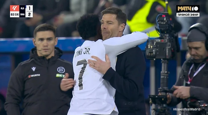Вингер «Реала» Винисиус после голевого паса на Родриго подбежал к Хаби Алонсо и обнял главного тренера.
