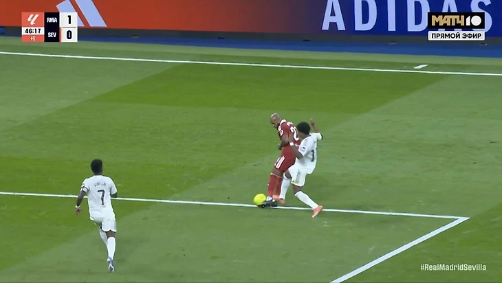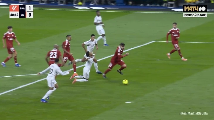 На 41-й минуте вингер «Реала», получив передачу на краю штрафной, ворвался в нее и рухнул на газон после того, как защитник «Севильи» Маркао Тейшейра коснулся его плеча.