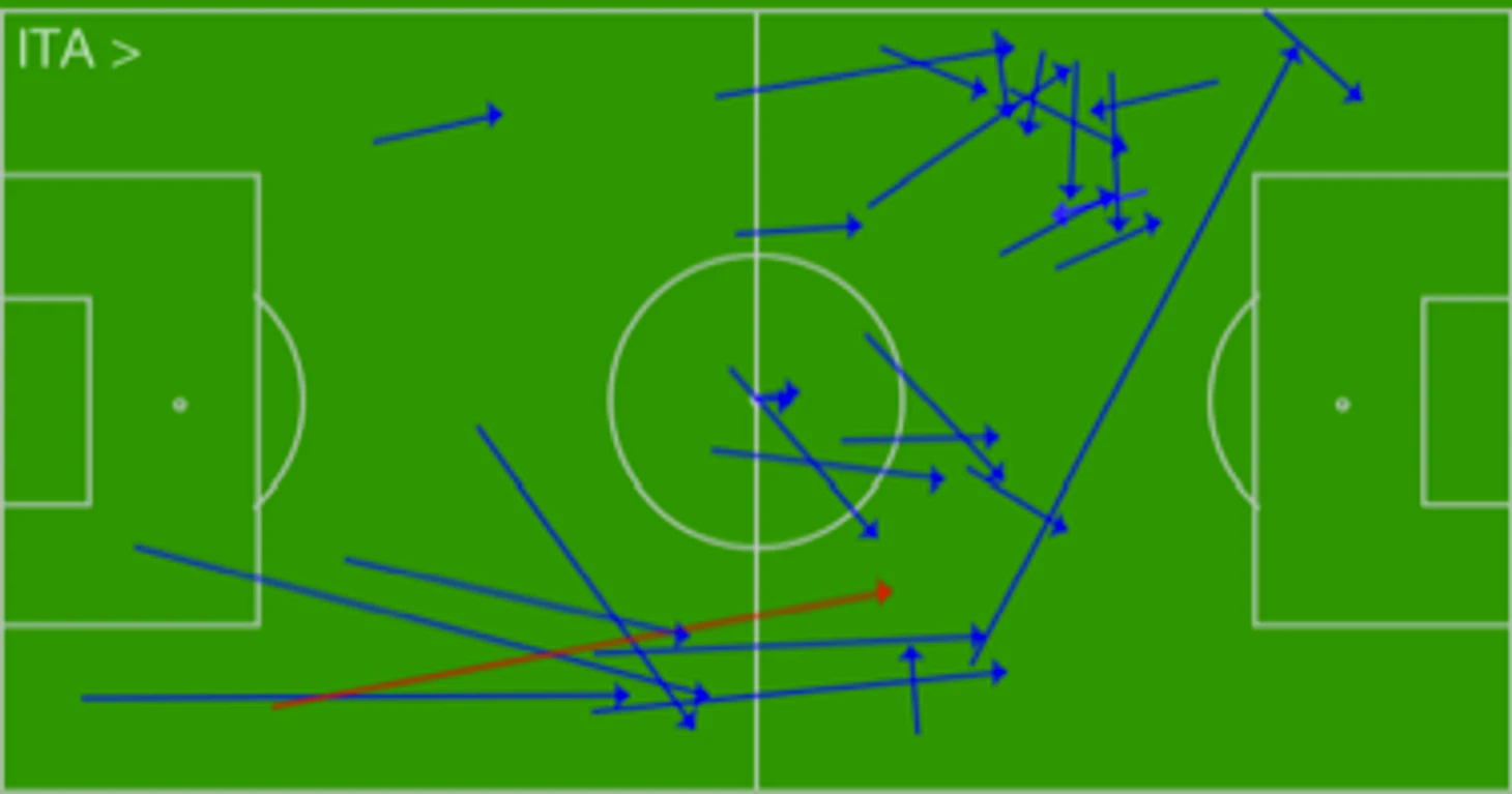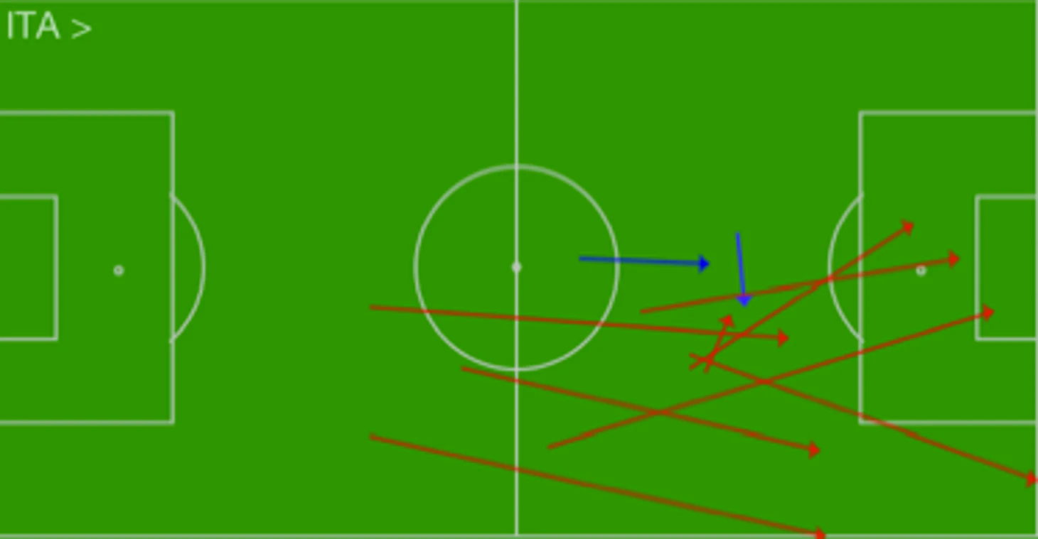 Марио Балотелли ни разу не получил мяч в чужой штрафной. Таблица передач, адресованных Марио, впечатляет: Испания просто выдавила его из штрафной и не дала ни единого шанса. Приходилось спускаться и бить издали, но оба удара прошли мимо.