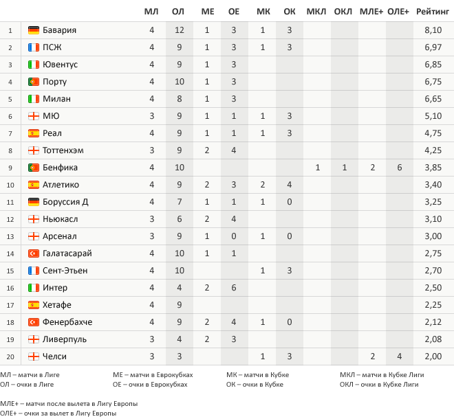 В двадцатку вернулся мадридский «Атлетико». Отметим регресс дортмундской «Боруссии», похоже, смирившейся с тем, что в этом сезоне лучший немецкий клуб – все-таки «Бавария».