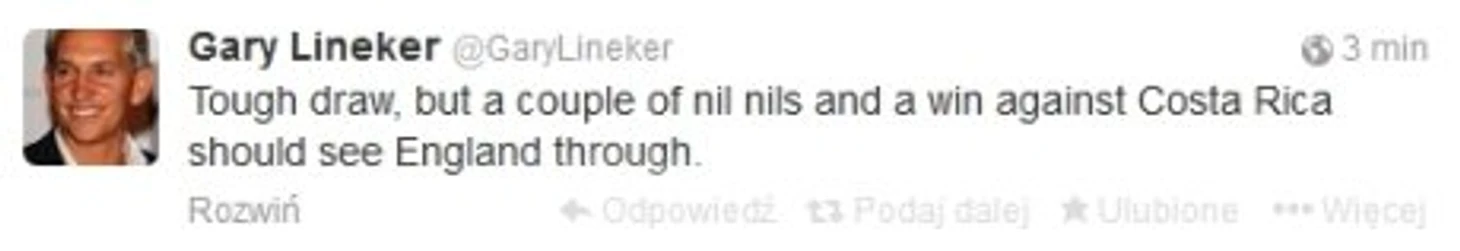 22:45 Гари Линекер, как автор афоризма о непобедимости немцев, нашел рецепт и для удачной игры сборной Англии: пара нулевых ничьих и победа над Коста-Рикой.