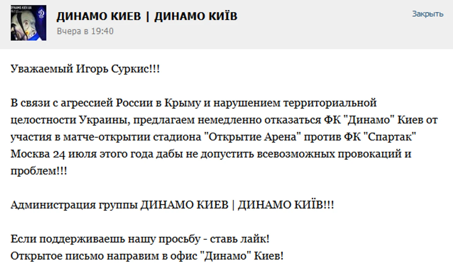 «В связи с агрессией России в Крыму и нарушением территориальной целостности Украины, предлагаем «Динамо» немедленно отказаться от участия в матче-открытии стадиона «Открытие Арена» против «Спартака» 24 июля этого года дабы не допустить всевозможных провокаций и проблем!», – говорится в заявлении группы «Динамо» в «ВКонтакте».