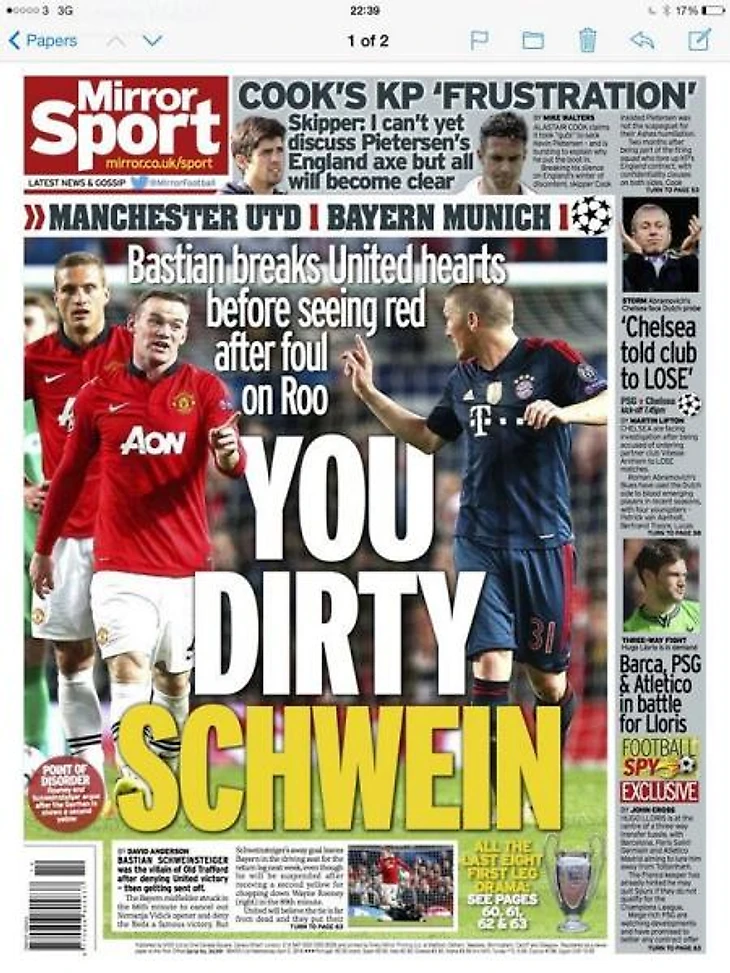 Решение мюнхенского клуба отказать в выдаче аккредитаций связано с тем, что после первой игры на «Олд Траффорд» (1:1) свежие номера таблоидов вышли с оскорбительными для хавбека «Баварии» Бастиана Швайнштайгера заголовками: «Ты свинья» и «Ты грязная свинья».