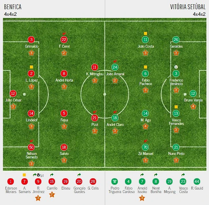 «Бенфика» первой из грандов потеряла очки в этом чемпионате, оступившись в домашней игре против «Витории Сетубал». Причём этот результат выглядит полностью закономерным. Подопечные Жозе Коусейру не стали запираться в собственной штрафной и при каждом удобном случае огрызались, доводя практически каждую атаку до логического завершения и несколько раз были достаточно близки к тому чтобы открыть счёт ещё в первом тайме. Что касается «Бенфики», то она также в первом тайме должна была забивать, но всякий раз на высоте был Бруну Варела. Хозяевам настолько легко удавалось приближаться к воротам соперника, что им в какой-то момент начало казаться, что забитый мяч является лишь делом времени. Хотя, пожалуй, так казалось всем. И тут «Сетубал» просто взял и забил. Венансиу ускакал от Линделёфа при подаче Нуну Пинту со штрафного и переправил головой мяч точно в угол. У Жулио Сезара не было ни единого шанса. Пропустив гол, «Бенфика» некоторое время откровенно тупила, не понимая, как это так они атаковали, а забил соперник. Но всё же после небольшой паузы снова бросилась на защитные редуты «Сетубала» и всё же сумела спастись от незапланированного поражения благодаря голу с пенальти в исполнении Хименеса. В самом конце встречи Серви был обязан забивать ещё один гол, но пробивая по пустым воротам шмальнул в перекладину. Благодаря этой ничьей «Витория Сетубал» набирает четыре очка и продолжает занимать место в верхней части таблицы.
