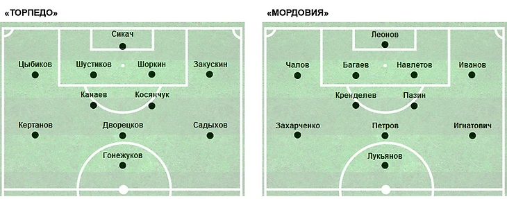 «Торпедо» (футболки - белые): №88 Сикач, №12 Цыбиков, №6 Шустиков, №44 Шоркин, №8 Закускин, №11 Косянчук (№7 Заерко, 79), №24 Канаев - к, №10 Кертанов (№32 Мельников, 84), №17 Дворецков (№14 Бояров, 66), №18 Садыхов (№15 Серёгин, 77), №20 Гонежуков.