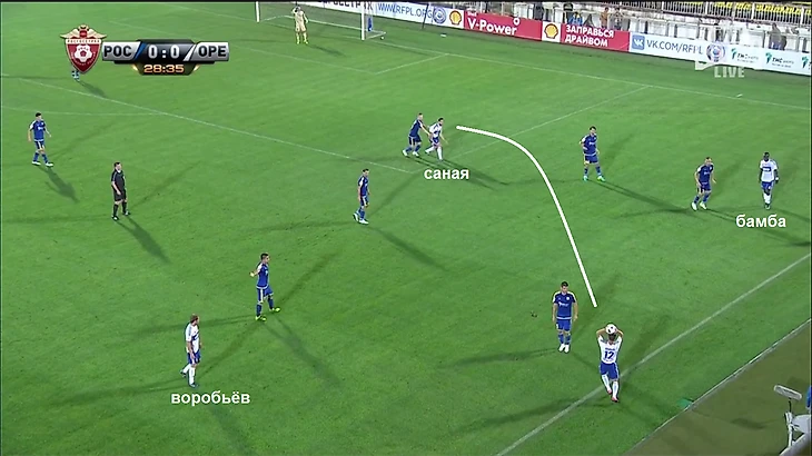 Защитнику некуда вбрасывать мяч из аута. Только назад Воробьёву был адекватный вариант. Но полузащитник настоял вкинуть вперёд. А там никакого развития, ведь Саная даже если бы и выиграл верховую борьбу, то отскок вряд ли достался бы игроку "Оренбурга". Тоже самое и с Бамба, который разместился ближе к угловому флажку.