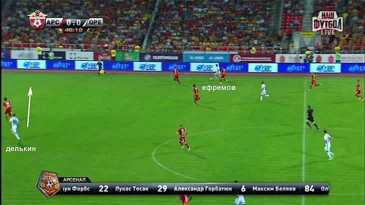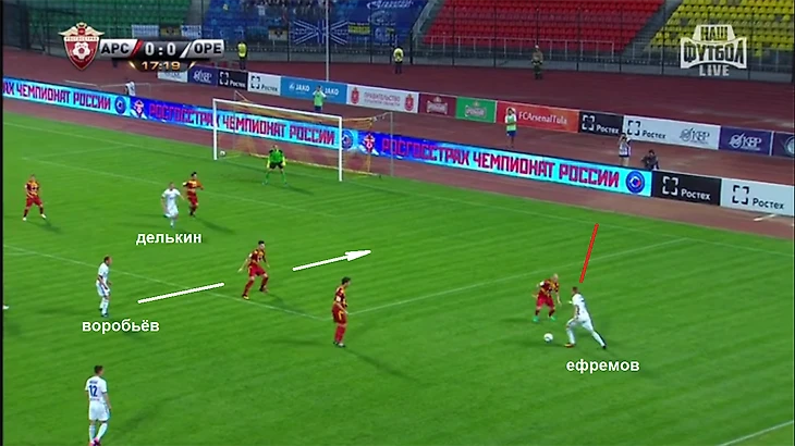 Очень классный момент был на 36 минуте в матче против "Арсенала". Там Ефремов быстро заполнил собой свободную зону и, получив пас от Бамба, бил по воротам. Но не попал, что самое обидное.Ефремов продвигался по своему флангу и ему пришлось надеяться только на себя. Делькин даже не предложил себя в свободной зоне. Он, наверное, думал, что пойдёт сразу же навёс. В итоге протаранить по бровке не удалось самому.