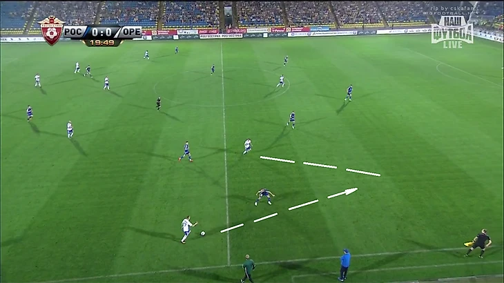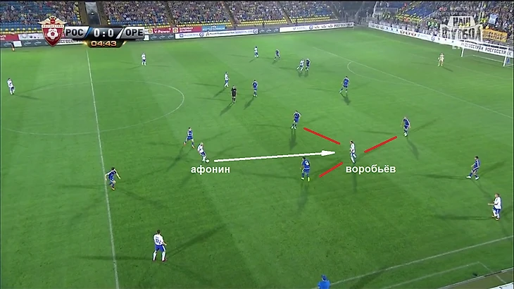 Вместо того, чтобы открываться в свободной зоне, Воробьёв стоит на месте. Ефремову приходиться отдавать пас стоячему партнёру. Затем Роман возвращает мяч Ефремову. И в итоге он оказывается окружен игроками "Ростова" и без продвижения вперёд.