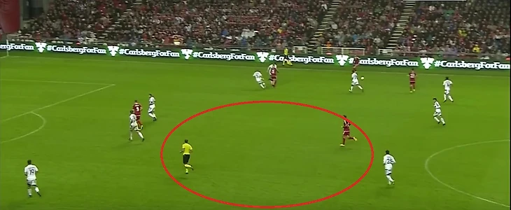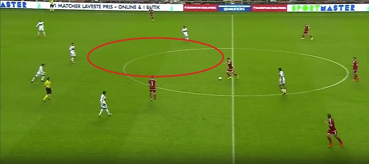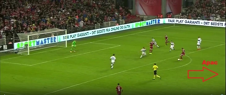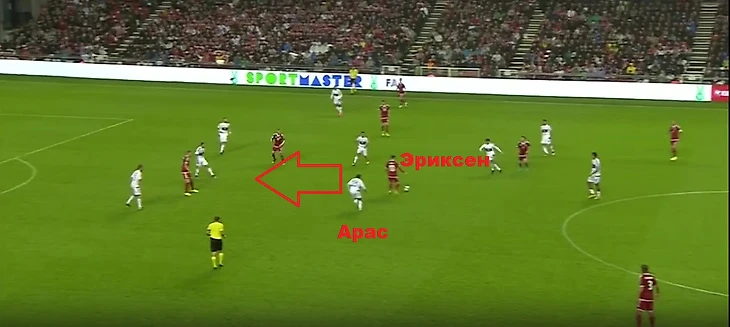 Линия защиты отступает, вместо поддержки контр-прессинга, а также слишком близко армянские игроки размещаются к своей штрафной площадке. Датчане свободно идут вперед, рядом с Эриксеном никого и огромное свободное пространство на поле, где нет армянского футболиста: