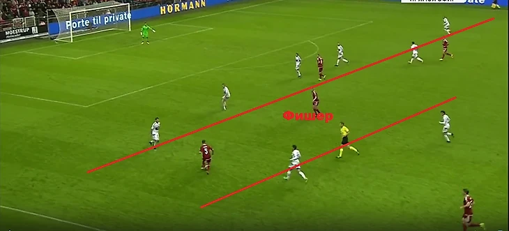 Фишер через несколько секунд свободно получит мяч между двумя линиями и снова без опеки пробьет по воротам, если бы не перекладина, счет мог бы стать 2-0: