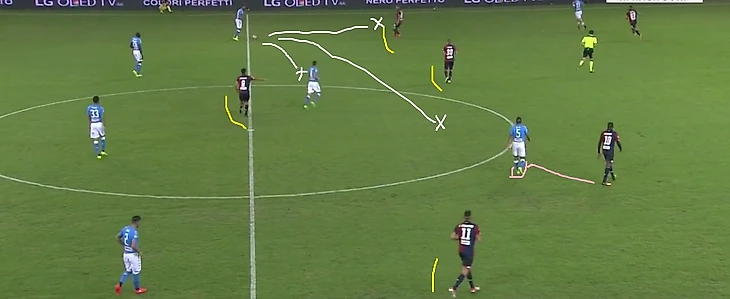 С первых минут бросилась в глаза, несколько иная роль Гамшика. Мы рассуждали о постепенном переходе словака к концу карьеры к более оборонительным действиям, однако здесь Сарри поставил жирный крест на наших теориях. Гамшик креативничал в атаке ближе к чужим воротам, чем условный Аллан, местами становясь на позицию классического плэймейкера. Лучшей зоной взаимодействия стал треугольник Аллан-Хюсай-Кальехон, в первом тайме привязавшие к своему флангу Лаксальта. По-прежнему тяжеловатым кажется Кулибали, который правда достаточно уверенно страховал фланг Гуляма, где постоянным гостем был генуэзец Лазович.