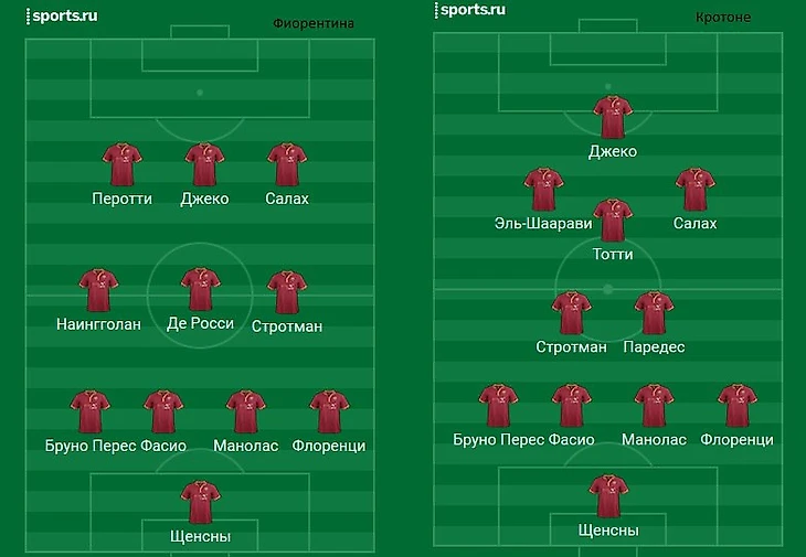 На "Стадио Олимпико" в гости к "волкам" пожаловал скромный "Кротоне", ведущий довольно скудное существование в реалиях Серии А. Попробовав уже 4-ю схему (на этот раз была взята на вооружение 4-1-4-1), Никола, кажется, совсем растерял наследие Юрича, строившего на юге Италии, прежде всего, игру, нацеленную на грамотные действия в обороне (неслучайно в СерииВ "Кротоне", главным образом, использовал схемы с 3 центрбэками и 2 тяжелыми опорниками). "Рома" же упустила на выходных практически маячившую на горизонте победу (или хотя бы ничью) в матче с "фиалками". Спаллети всегда умел делать выводы и провел небывалую ротацию в составе "Ромы". Сразу 3 футболиста оказались на скамейке перед очередным матчем.