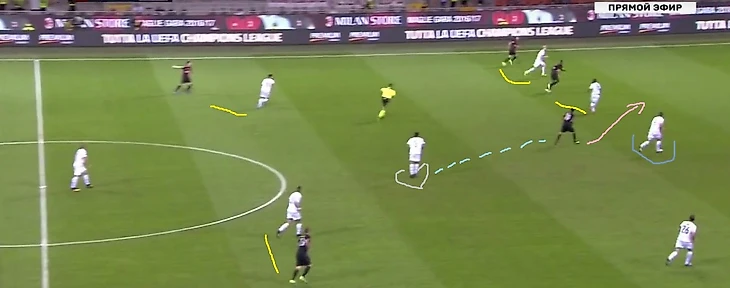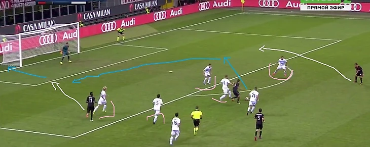 Момент незадолго до первого гола "Милана". Мяч находится в воздухе после передачи Монтоливо в сторону Бакки, который делает забегание между защитниками (розовый цвет). Все игроки "Лацио" плотно привязаны к футболистам "Милана", кроме Раду (голубой цвет) страхующего вход в штрафную. Исключением является Катальди, неспешно следующий к месту падения мяча, при этом не заметивший одинокого колумбийца, который именно из его зоны совершает рывок. Данный эпизод заблокируется удачной игрой Раду, но, в целом, станет примером не самого лучшего тренда.