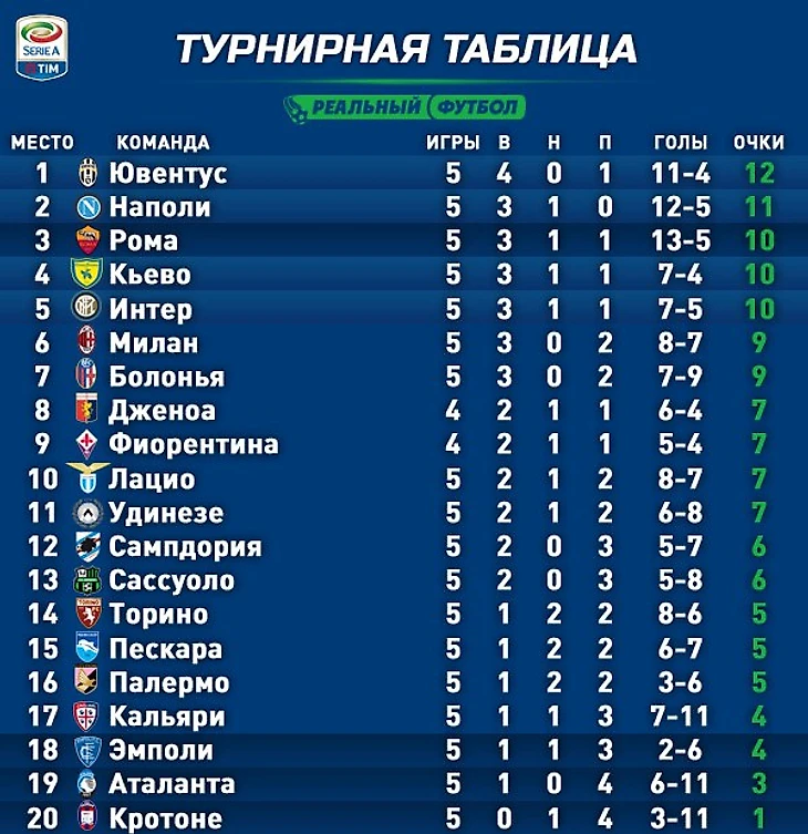 Воспользовавшись осечкой "Наполи", лидерство вернул себе туринский "Ювентус". Но следующей осечки "бьянконери" уже могут не простить так легко. И "Рома", и "Интер", и даже "Милан" уже видят силуэт "старой синьоры". Наконец-то разорванной в таблице оказалась пара генуэзских клубов. Несмотря на добротную и боевую игру "Дории" с "Болоньей", их "вечным" соперникам по городу удалось отобрать очки у самих "партенопейцев". Неожиданно надолго в нижней части турнирной таблицы застряли "Сассуоло" и "Торино", хоть и показавшие качественный футбол, но все же не не сумевшие воплотить его в очковые пополнения. Впервые за сезон из зоны вылета выбрался "Палермо", отправив туда "Эмполи", проигравшего домашний матч дружине Франка де Бура. Абсолютным аутсайдером Серии А была и продолжает оставаться команда Давиде Николы, набравшая лишь одно очко в пяти турах.