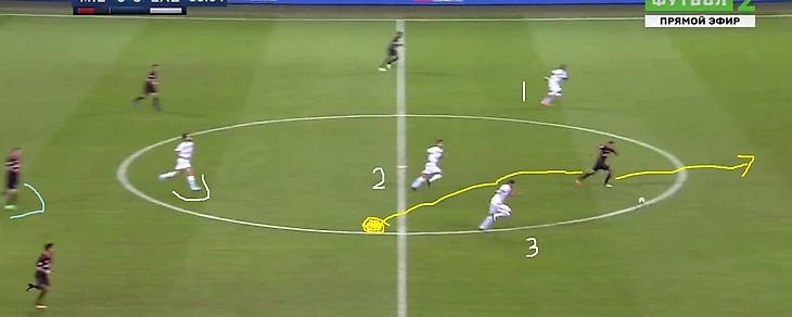 Мяч у Гуляма, и алжирец начинает очередную атаку "Наполи". Все четыре номинальных игрока атаки (желтый цвет) строго занимают свои позиции, закрывая своего игрока. Как видно из ситуации деваться левому защитнику некуда, поскольку все три реальных пути перекрыты или опасны перехватами, и он отдает мяч обратно Кулибали. Зацепите также взглядом парочку Аллан-Нтчам (розовый цвет). Как я уже отмечал выше, Юрич обратил внимание на то, что именно с паса бразильца раскатывается атака по флангу, и, видимо, попросил француза играть персонально с ним в фазе оборонительных действий.
