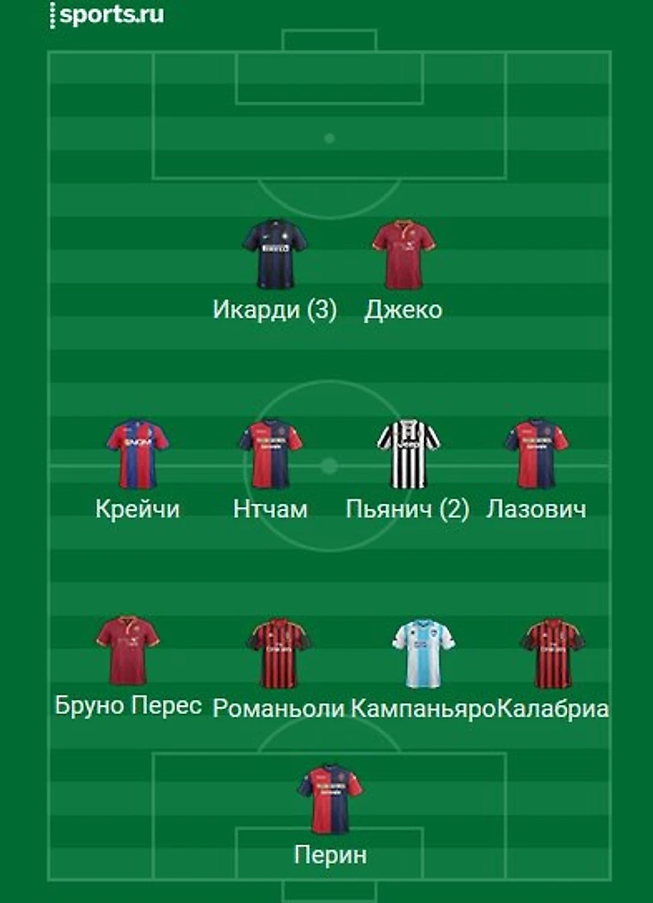 Однако добротному количеству моментов, создаваемых с креном вправа (самым опасным стал удар Гамшика в перекладину), противостояла предельно выученная команда. Юрич, будучи в клубе не так долго, уже успел наладить взаимозаменяемость. Травма Велозу позволила Нтчаму провести близкий к идеалу матч, а срыв задней поверхности бедра у Паволетти, настигший "Дженоа" в середине первого тайма, не стал трагедией. Вышедший Симеоне (сын того самого!) сместил Ригони ближе к атаке, сам же заняв его место. Отдельно стоит выделить и Перина, вернувшегося из лазарета лишь два матча назад, но уже успевшего сотворить пару локальных чудес, что без вариантов сделало его лучшим вратарем тура.