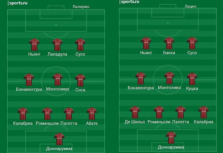 Если говорить точнее, то всего лишь 23 часа провел "Милан" в числе команд, которые, если бы чемпионат заканчивался пятым туром, имели бы шанс представлять Италию в главном клубном турнире Старого Света. Так случилось, что сам тур не имел более громкой афиши, чем противостояние "россонери" с "Лацио", для которого и был выделен отдельный вечер. После двух туров экспериментов, один из которых закончился крайне неудачно (против "Удинезе"), Монтелла вернулся к исходной игровой схеме и набору футболистов. От первого тура состав отличали лишь кандидатуры фланговых защитников. Но травма Антонелли и не самая яркая игра Абате во многом убирали все лишние вопросы по данному тренерскому решению. Для наглядности предлагаю сравнить стартовые 11 двух последних туров.