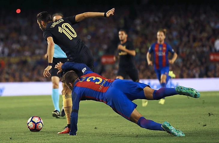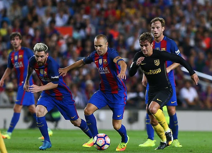 Игра шла по схожему для последних встреч этих команд сценарию. «Барса» подолгу держала мяч, быстро переходила центр поля, но вязла в густых зарослях защиты. Наименее заметным при такой игре был Луис Суарес, мяч его практически не находил, а когда он брал дело в свои руки (зачеркнуто) ноги, его моментально обезоруживали, распистолечивали. «Атлеты» неприятно огрызались и время от времени беспокоили Тер Штегена. Опаснее всего были выпады Гризманна и Карраско — первый отдавал потенциально голевой пас на Гамейро, но Маскерано в последний момент успел выбить мяч из-под ног новичка гостей, а с ударом по воротам второго справился немецкий кипер.