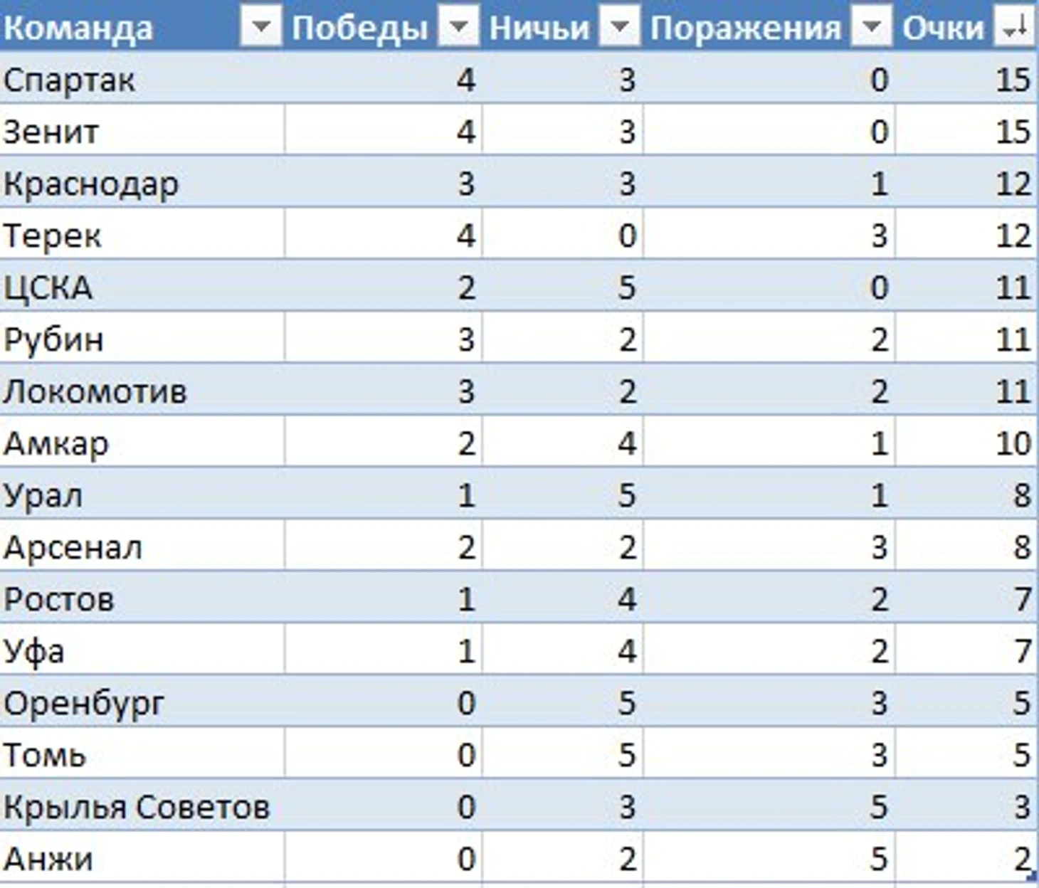 Таблица при гипотезе 0,6 xG = 1 гол. Правда в данном случае еще учитываются пенальти – если разница между командами меньше 0,15 xG внутри игры, то той, которая била пенальти, я пишу победы. Считаю это справедливым достаточно.