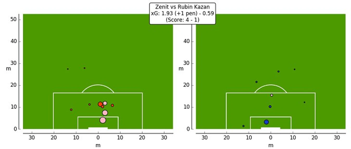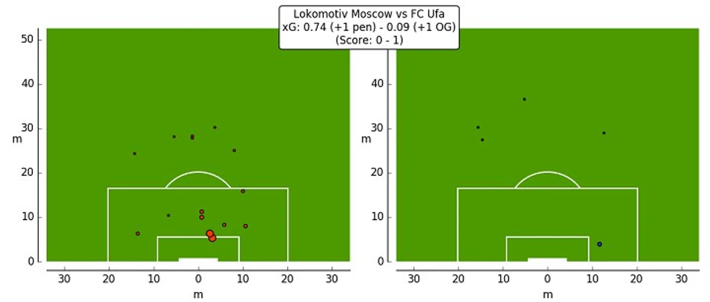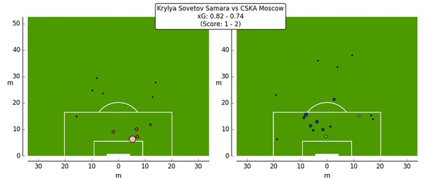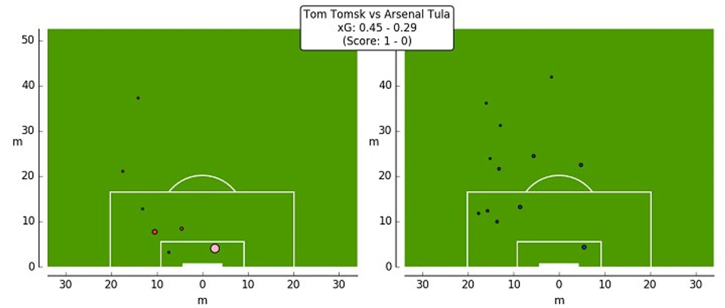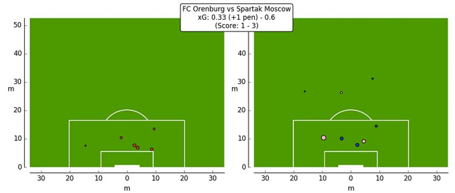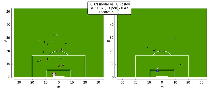 Единственное отличие от модели Кэйли состоит в отсутствии подгона xG под реализацию разными игроками ударов, во-первых, потому что я не до конца понял, что именно он делает, во-вторых такой подгон оправдан только для игроков, которые совершили больше 100 ударов за последние 5-6 лет, а таких в РФПЛ, я думаю, немного. Ещё одна проблема, ведущая к небольшому отличию от результатов Кэйли (я тестировал на последних выложенных им картинках), состоит в том, что без просмотра матча иногда сложно понять был ли удар нанесён в контратаке и вообще, что этому удару предшествовало, однако эту проблему с горем пополам удалось разрешить и свести отличие наших вычислений от результатов Кэйли до минимума.