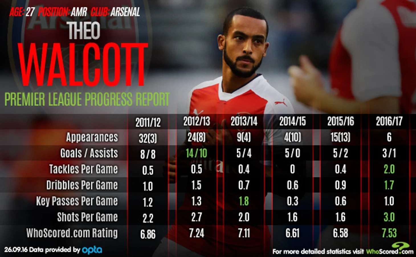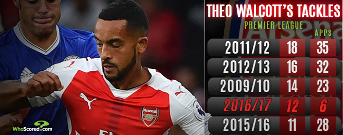 Даже WhoScored выпустило отдельную статью по поводу нынешней игры Тео в последних матчах. Со времени моего последнего обзора прошло всего 2 недели, а я уже готовлюсь хвалить Уолкотта; вы можете обвинять меня в непоследовательности, но я лишь описываю то, что вижу на поле и если начал свой сезон Тео не в лучшей форме, то последние несколько матчей игра вечно молодого англичанина радует меня своей трезвостью и рассудительностью в решениях. Так, за предыдущий матч я насчитал на счету нашего флангового нападающего целых 2 отбора и один перехват, что констатирует факт отработки Уолкотта в обороне. Да и было бы бездумно не давать барбадосцу указаний помогать Белльерину в защите в матче с таким-то соперником. Но я скажу вам больше: Уолкотт cовершает большое количество отборов систематически и предоставлю данную табличку от WhoScored: