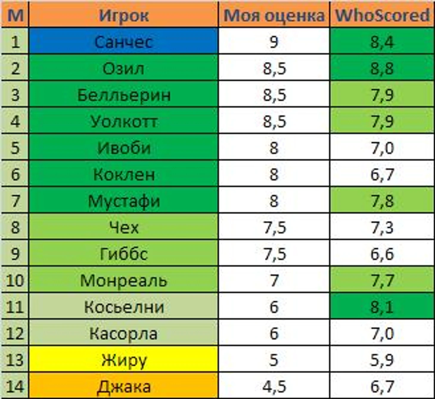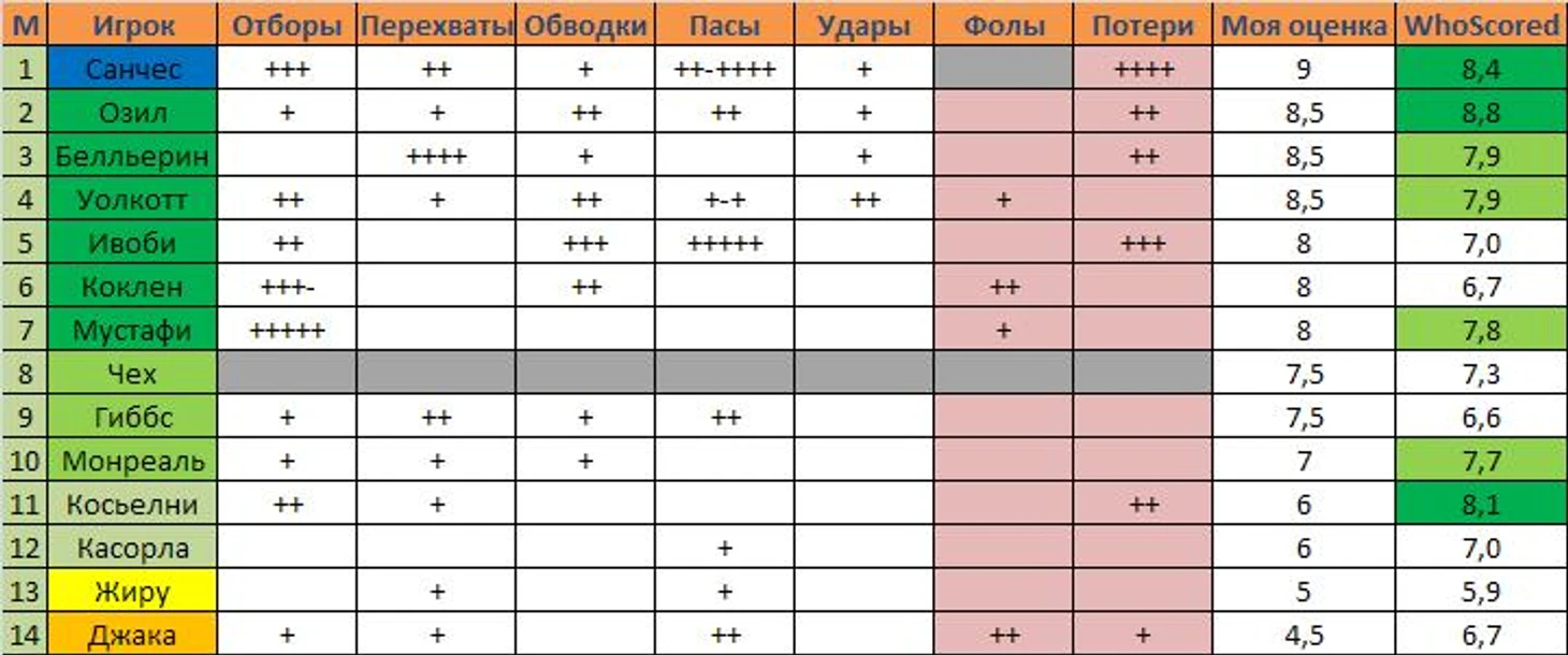 В динамике игры данный аспект не совсем читался, но решил внять советам комментаторов прошлого поста и занялся подсчётом статистики самостоятельно: весь матч сидел за экраном с листочком и вручную ставил плюсики игрокам за то или иное полезное(вредное) действие (табличку целиком увидите в конце поста). Таким образом, к концу матча наибольшее количество оригинальных пасов у себя в активе имели Санчес и Ивоби, что натолкнуло меня на мысль о том, что, возможно, в лице нигерийца Венгер готовит Арсеналу замену Озила в будущем. Не знаю, связано это с реальным желанием немца уйти из команды в ближайшие несколько трансферных окон или же Арсен заблаговременно готовит фундамент команды для нового тренера.