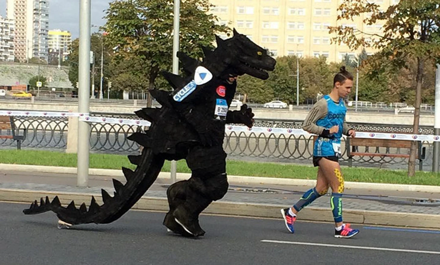 годзиллу видел на трассе, как и зека с полицейским - они сначала вообще бежали в наручниках прикованные к друг другу - но потом их расстегнули. про голых болельщиц тоже порадовало - лучший плакат дня, имхо) я даже подсознательно чуть ускорился))