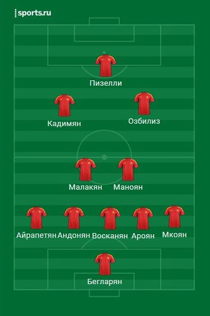 Скорее всего, Варужан Сукиасян вновь отдаст предпочтение модулю 5-4-1. Однако на этот раз возможно он преподнесет сюрприз, играя первым номером дома. Поэтому возможна и схема в виде 4-3-2-1 которая была всегда свойственно Сукиасяну на клубном уровне. Но во всяком случае, нужно готовится к двум вариантам вероятной расстановки. Маноян будет выполнять функции методиста. Другой важный момент – возможная высокая степень свободы Маркоса Пиззелли, который если не будет играть ярко выраженного форварда, то разместится под единственным нападающим. На него как всегда, тренер будет рассчитывать: на его дальние удары и скрытые передачи из-за спин защитников. На остальных позициях все худо бедно. Также, многое будет зависеть и от Араса Озбилиза, но стоит отметить, что его функциональное состояние оставляет желать лучшего.
