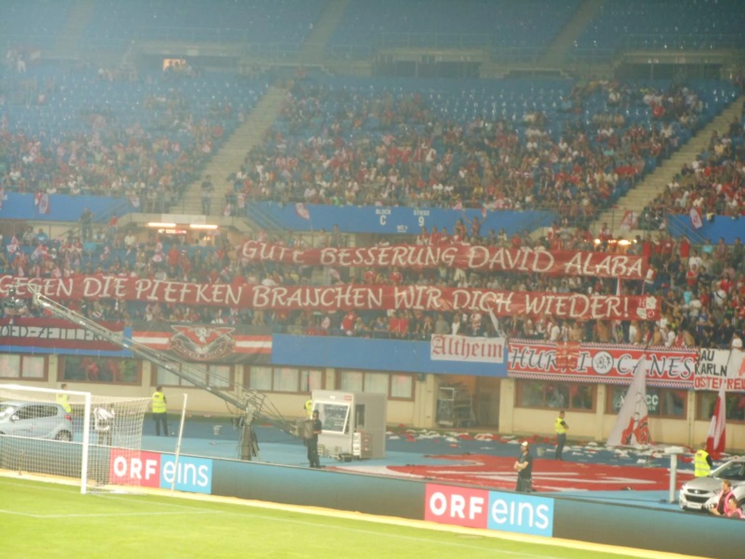 На нем написано "Скорейшего выздоровления! Ты нам очень нужен против хвастунов из Германии!" Piefken - это такое уничижительное прозвище для немцев, в данном случае болельщиков, которое используют Австрийцы, но чаще именно жители Вены. Поэтому когда немцы уступили аргентинцам австрийские болельщики праздновали двойную победу. Их очень сильно задевают успехи "большого соседа" и когда сборная Германии оступается для болельщиков из Австрии - это очень приятно.