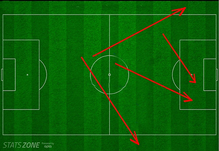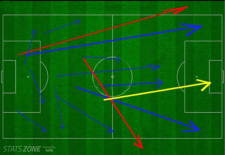 Синие стрелки - точные пасы, красные стрелки - неточные, (бонус: желтая - траетория голевого удара).