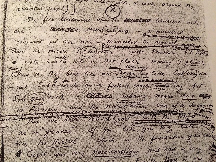 Второе. В русскоязычном издании лекций по русской литературе, которые Набоков читал в США, приведен снимок его черновика. В лекции о «Мертвых душах», чтобы объяснить, как правильно произносить фамилию Собакевича, Набоков пишет от руки: Sob okay vich (то есть Собокэйвич), not Sobakevich (Собэйкивич) as a football coach might say. Грубо говоря, правильно так, а не по-простому, как мог бы сказать футбольный тренер.