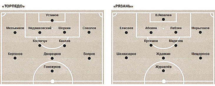 Стартовый состав «Торпедо» оказался точно таким же, как и в победном поединке предыдущего тура в Подольске. Так что отбывший дисквалификацию Цыбиков остался в запасе уже по игровым причинам – на его позиции снова играл Мельников. У «Рязани» произошла одна вынужденная замена: вместо дисквалифицированного правого защитника Ващенко в состав вернулся 38-летний ветеран Елисеев. Произошла замена и на левом фланге средней линии, где появился Мещеряков, сменивший Мишина.