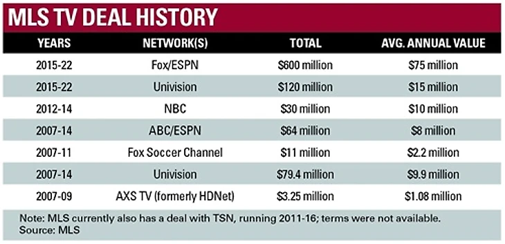Растет и количество американского соккера на экранах. Если в 2014 всего 98 матчей были показаны по ТВ, то в 2015 на экранах было доступно уже 340 поединков МЛС. Вместе с количеством матчей МЛС на ТВ и их рейтингом, возрастают и доходы МЛС от телевизионного контракта. Действующее сейчас соглашение было заключено в 2014. После долгих переговоров представители лиги выбили себе восьмилетние соглашения с ESPN, Fox и Univision, по которому МЛС полагается 90 миллионов долларов ежегодно. Истекает этот контракт в 2022 году, и именно поэтому лига в лице ее комиссионера Дона Гарбера так спешит добиться расширения до 28 клубов уже к 2020 году.